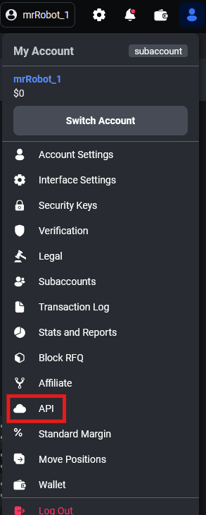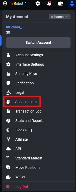 Step 1. Login to Deribit - Begin by logging into your Deribit account at www.deribit.com. Navigate your mouse to the top right of the screen and you will see the screenshot below where you can click on "Subaccounts" where we will first make a Sub Account for you to use that is isolated and firewalled from your main account. Ensure you are in the Main Account when trying to create a Sub Account.