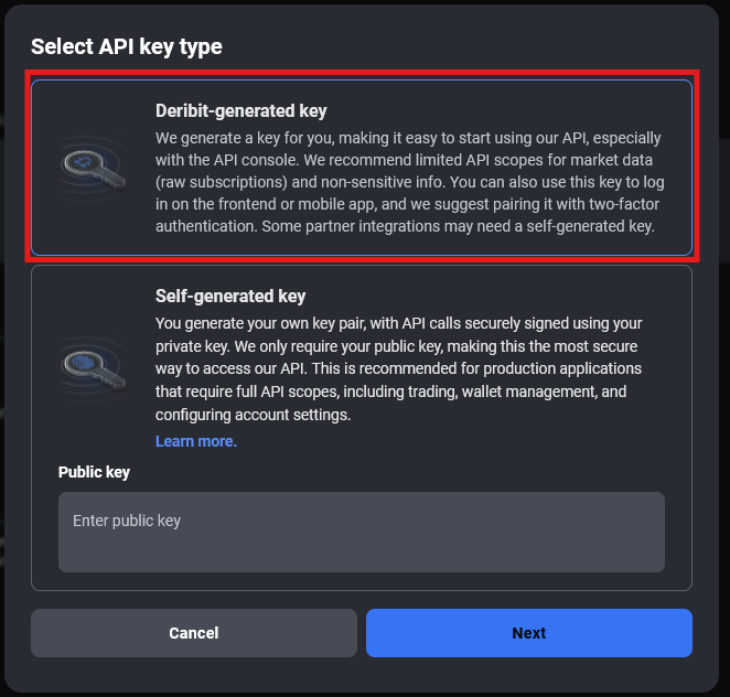 Step 6. Choose API Key Type - You will now be asked to select the API Key type. Choose "Deribit-generated key" and then click on the "Next Step" button.