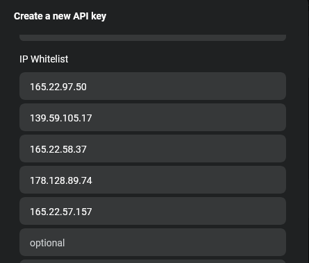 After setting the permissions above, scroll down in the same form to the IP Whitelist section and enter the trusted IP addresses provided below. This ensures maximum security for your account.